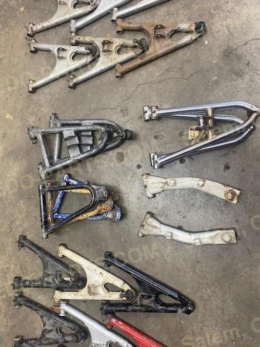 New and used A-arms, J-arms, D-arms, (control arms) bushings for A-arms, J-arms and D-Arms, ball joints, shocks, shock wear, shock springs, swingarms, dog bones, carriers, skid plates, carrier bearings, carrier bearing seals, and carrier brake stays. These may be Factory OEM, OEM replacement, OEM modified, or aftermarket parts.