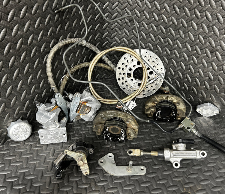 New and used brake shoes, brake calipers, brake discs, brake pads, brake rotors, brake rotor guards, brake covers, brake pistons, front brakes, rear brakes, brake master cylinders, brake reservoirs, brake reservoir caps, brake reservoir covers, brake block offs, brake lines and hoses, brake line clamps, and brake hardware. These may be Factory OEM, OEM replacement, OEM modified, or aftermarket parts.